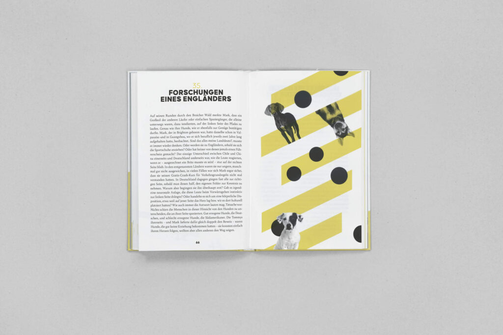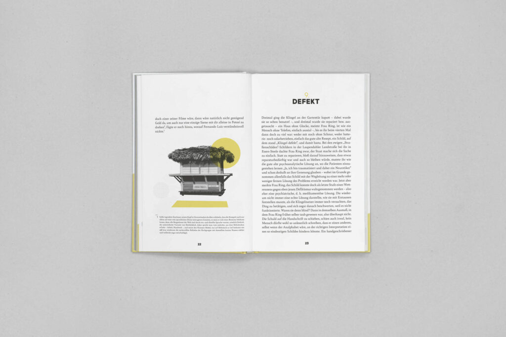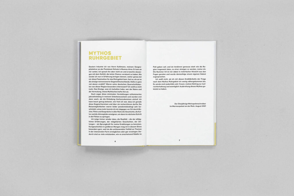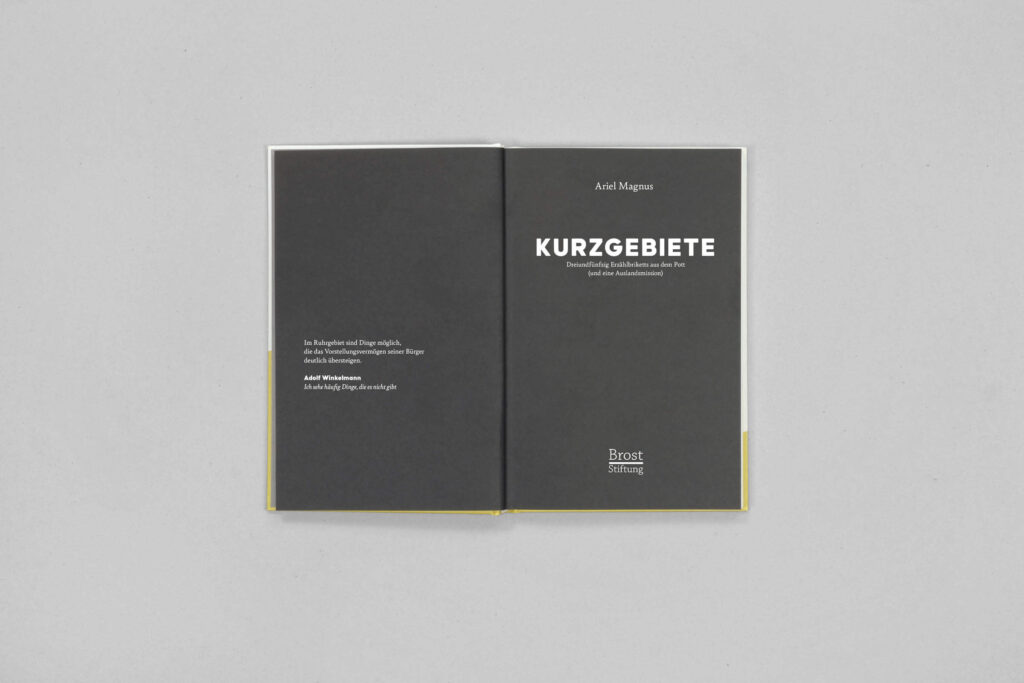 Die Brost-Stiftung lädt regelmäßig bemerkenswerte Autoren als Metropolenschreiber nach Mülheim an der Ruhr ein. Diesmal folgte der Argentinier Ariel Magnus der Einladung und setzte sich in 53 Kurzgeschichten mit der Ruhr und dem Ruhrgebiet auseinander. Entstanden sind fiktive Geschichten mit wiederkehrenden Personen, grotesken Situationen und humorvollen Details. Die typografische Umsetzung markiert mit starken Überschriften jede neue Erzählung. Das Lesevergnügen wird durch bedeutungsoffene Digitalcollagen erweitert.