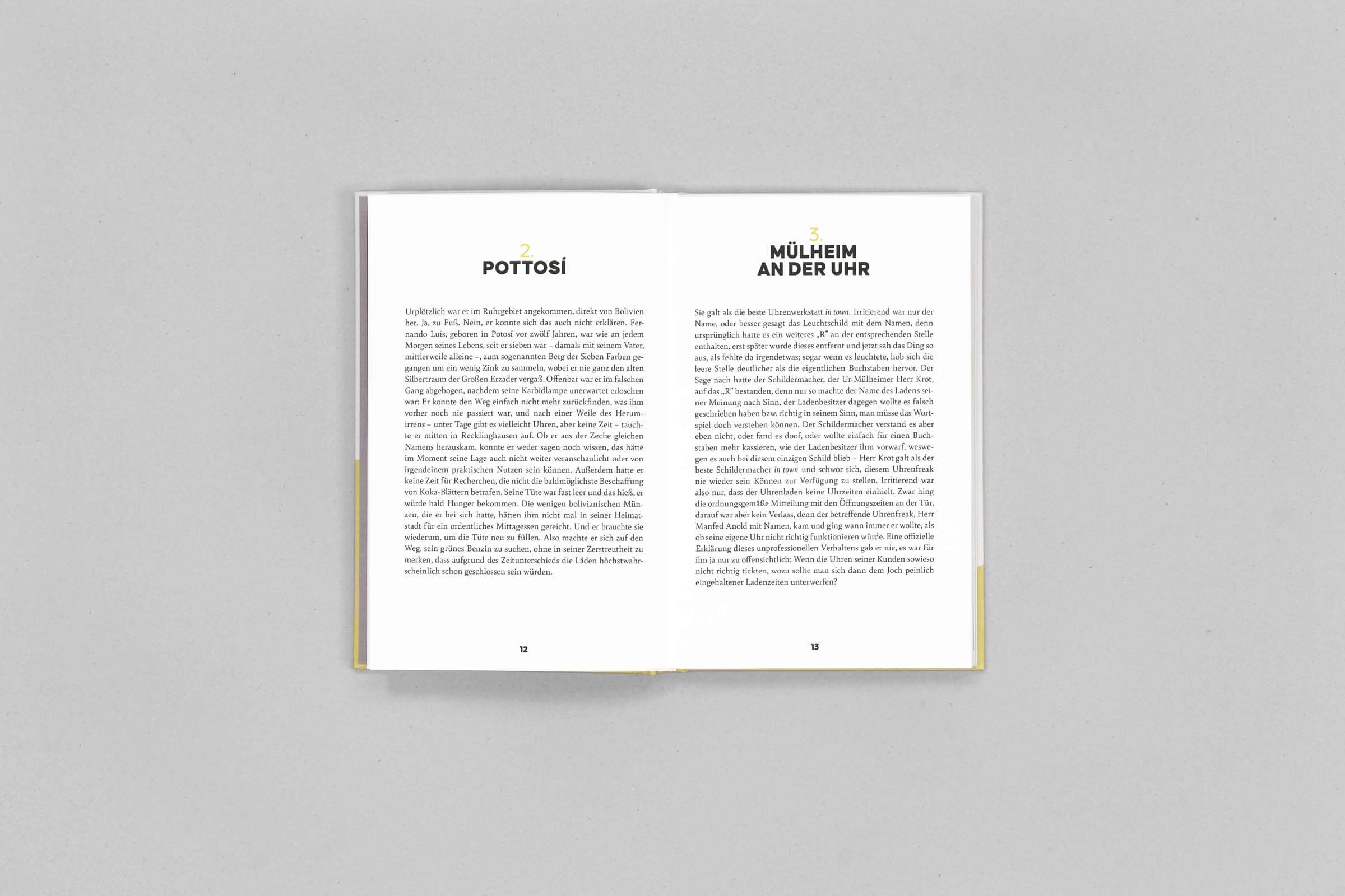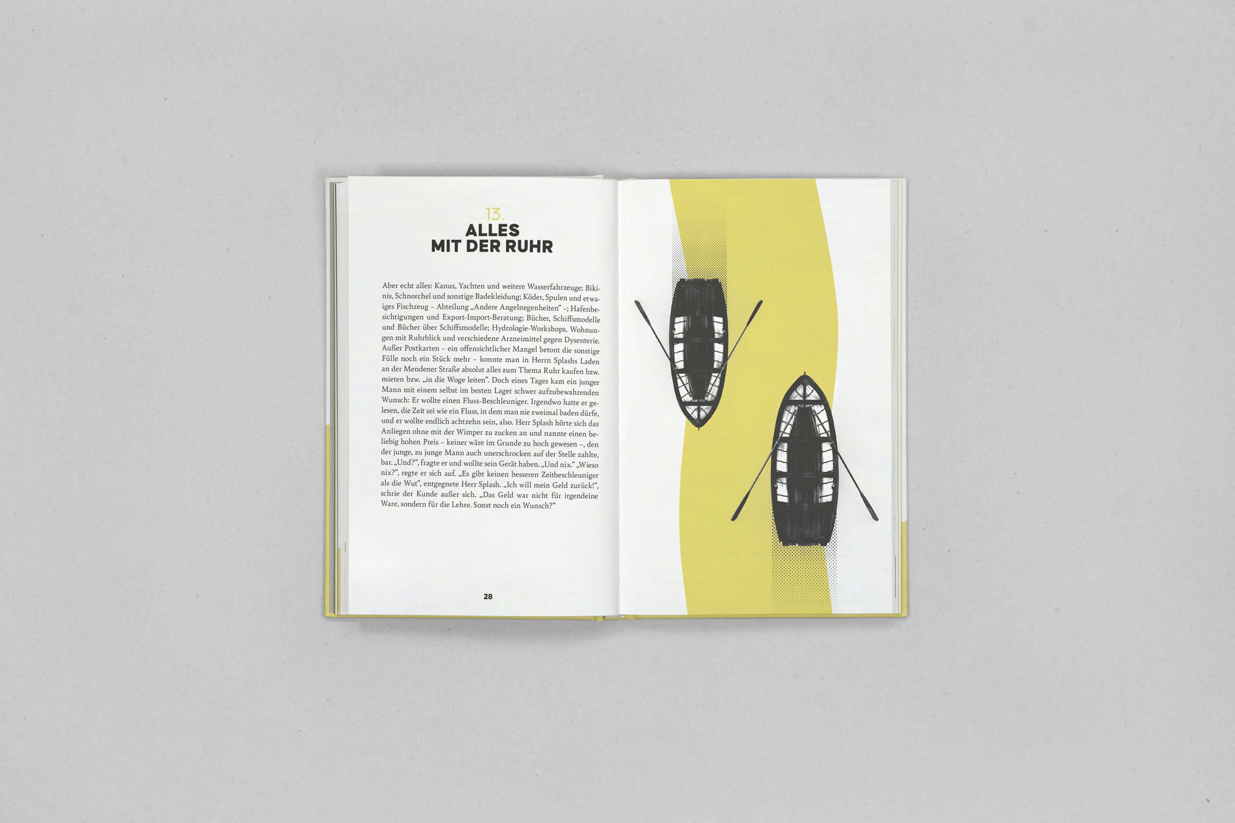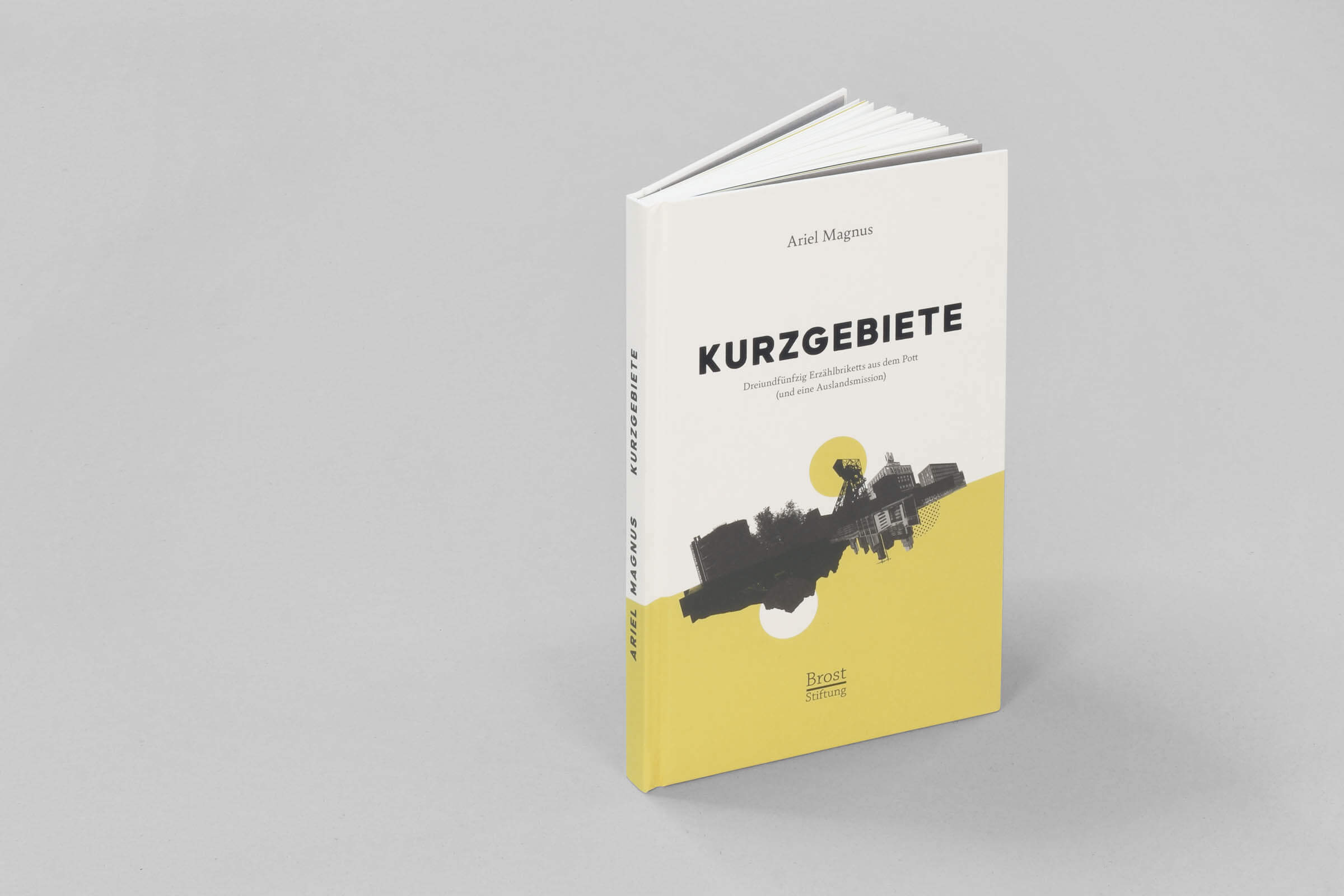 Die Brost-Stiftung lädt regelmäßig bemerkenswerte Autoren als Metropolenschreiber nach Mülheim an der Ruhr ein. Diesmal folgte der Argentinier Ariel Magnus der Einladung und setzte sich in 53 Kurzgeschichten mit der Ruhr und dem Ruhrgebiet auseinander. Entstanden sind fiktive Geschichten mit wiederkehrenden Personen, grotesken Situationen und humorvollen Details. Die typografische Umsetzung markiert mit starken Überschriften jede neue Erzählung. Das Lesevergnügen wird durch bedeutungsoffene Digitalcollagen erweitert.