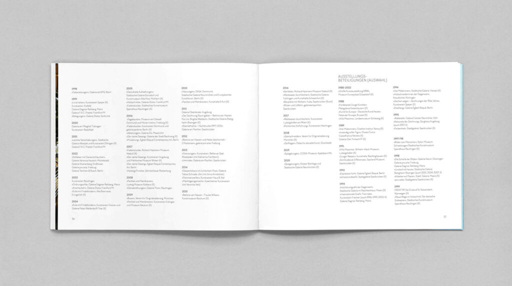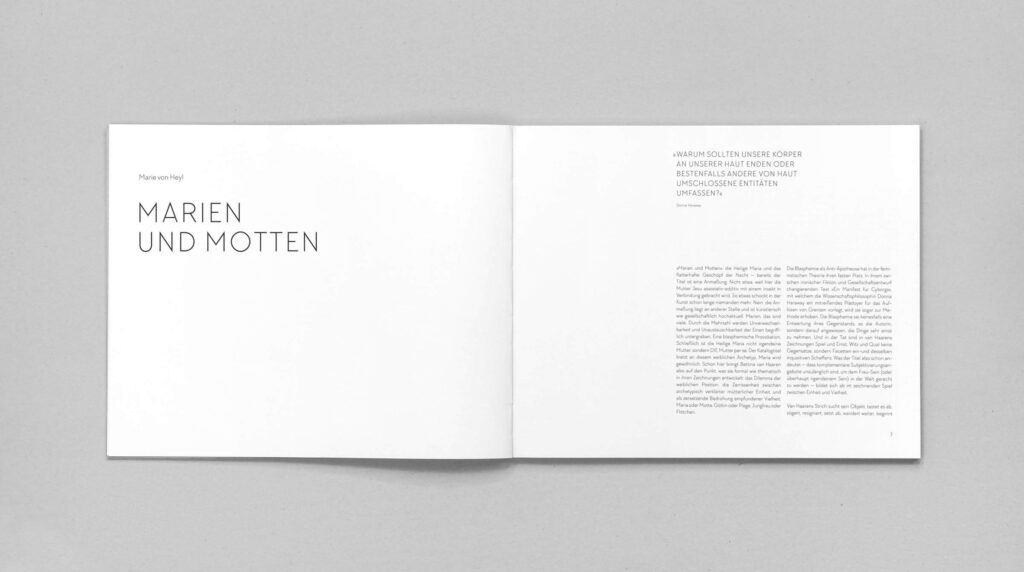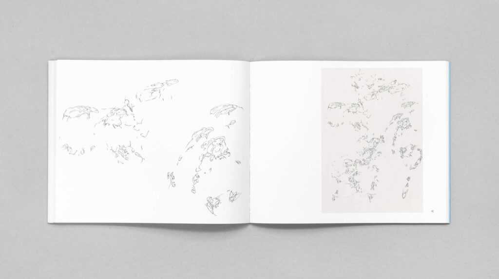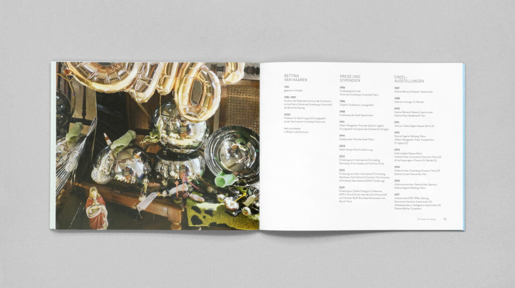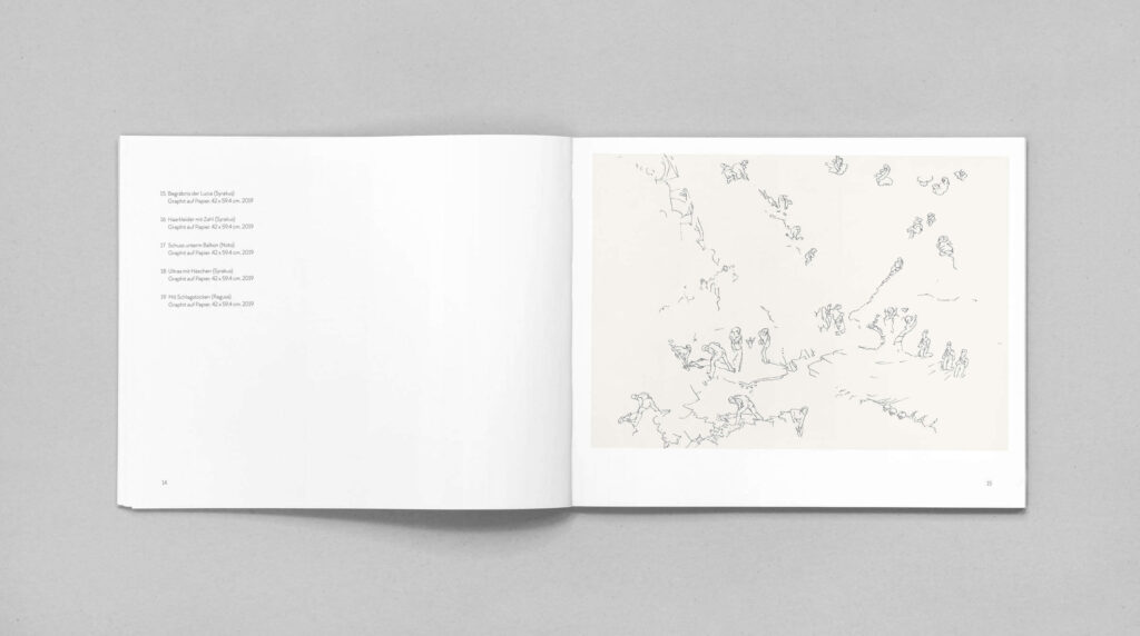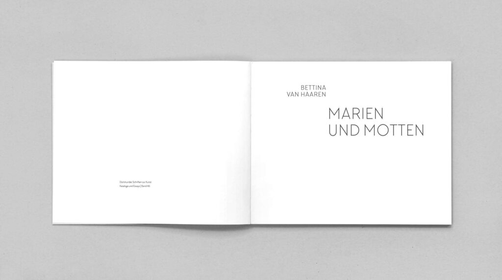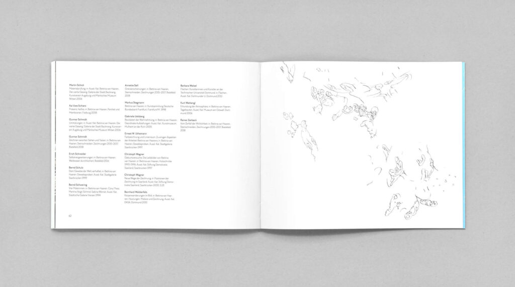 Bei diesem Buchprojekt stand die Materialität im Mittelpunkt: Der rote Buchrücken, die raue, graue Buchbinderpappe und das blaue Vor- und Nachsatzpapier setzen einen starken Rahmen. Im Inneren warten die Zeichnungen von Bettina van Haaren darauf, entdeckt zu werden. Die Texte verbinden sich mit viel Freiraum mit den Abbildungen. Beim Durchblättern erfreut man sich am selbstbestimmten Auftauchen des hellblauen Vor- und Nachsatzpapiers, das wie eine Klammer das Buch zusammenhält.