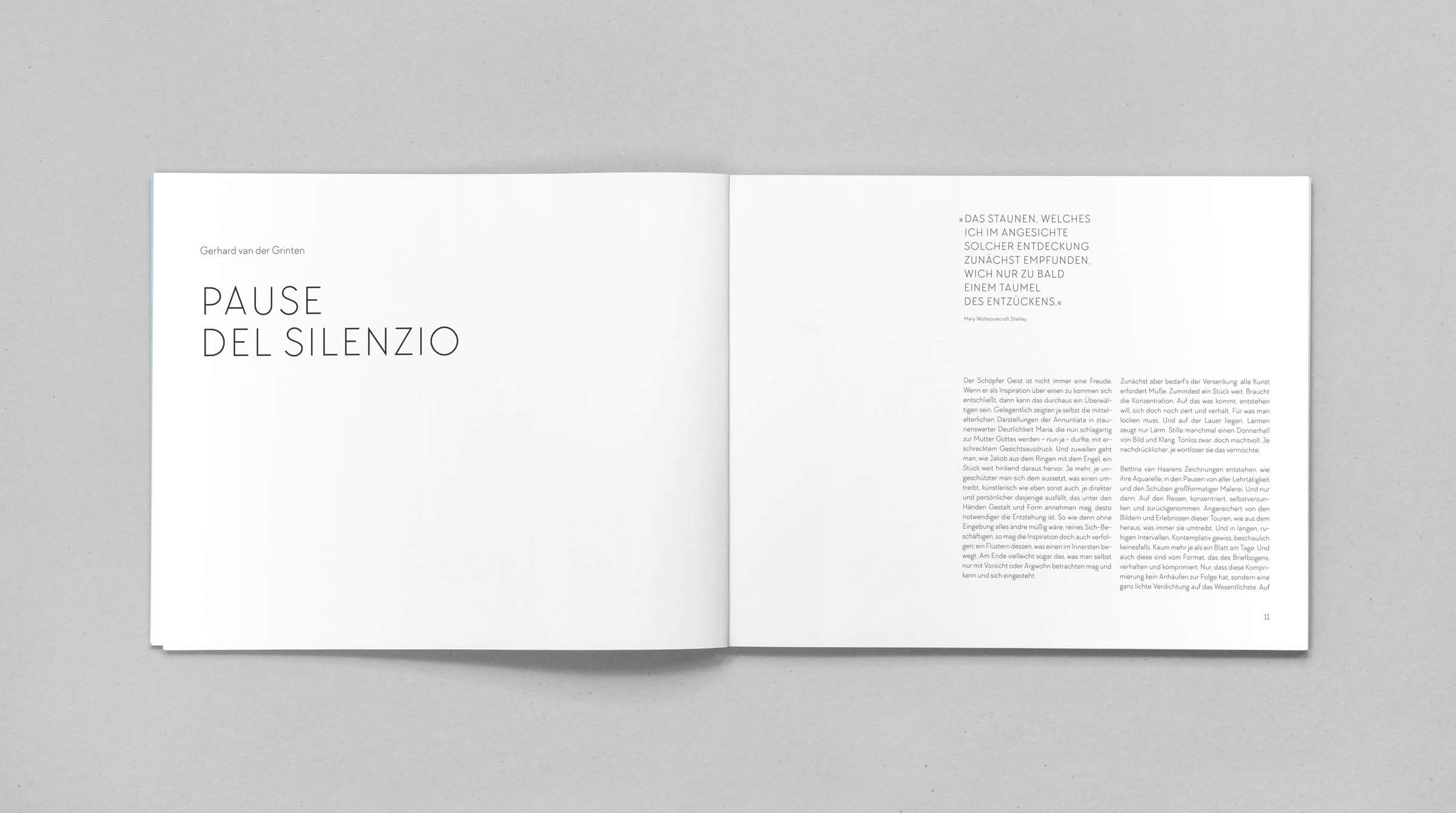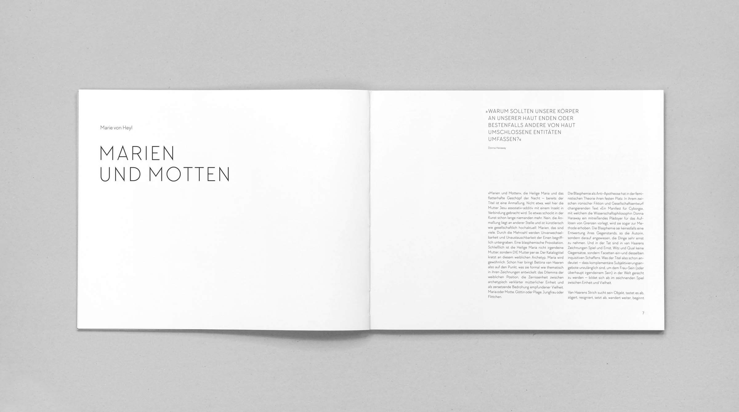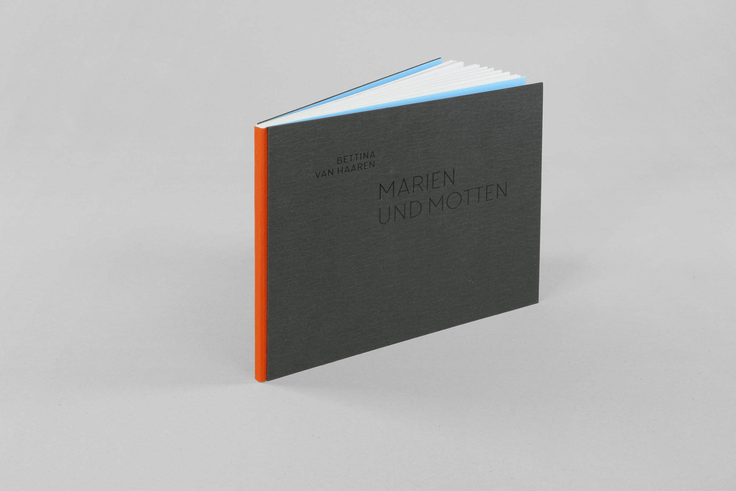 Bei diesem Buchprojekt stand die Materialität im Mittelpunkt: Der rote Buchrücken, die raue, graue Buchbinderpappe und das blaue Vor- und Nachsatzpapier setzen einen starken Rahmen. Im Inneren warten die Zeichnungen von Bettina van Haaren darauf, entdeckt zu werden. Die Texte verbinden sich mit viel Freiraum mit den Abbildungen. Beim Durchblättern erfreut man sich am selbstbestimmten Auftauchen des hellblauen Vor- und Nachsatzpapiers, das wie eine Klammer das Buch zusammenhält.