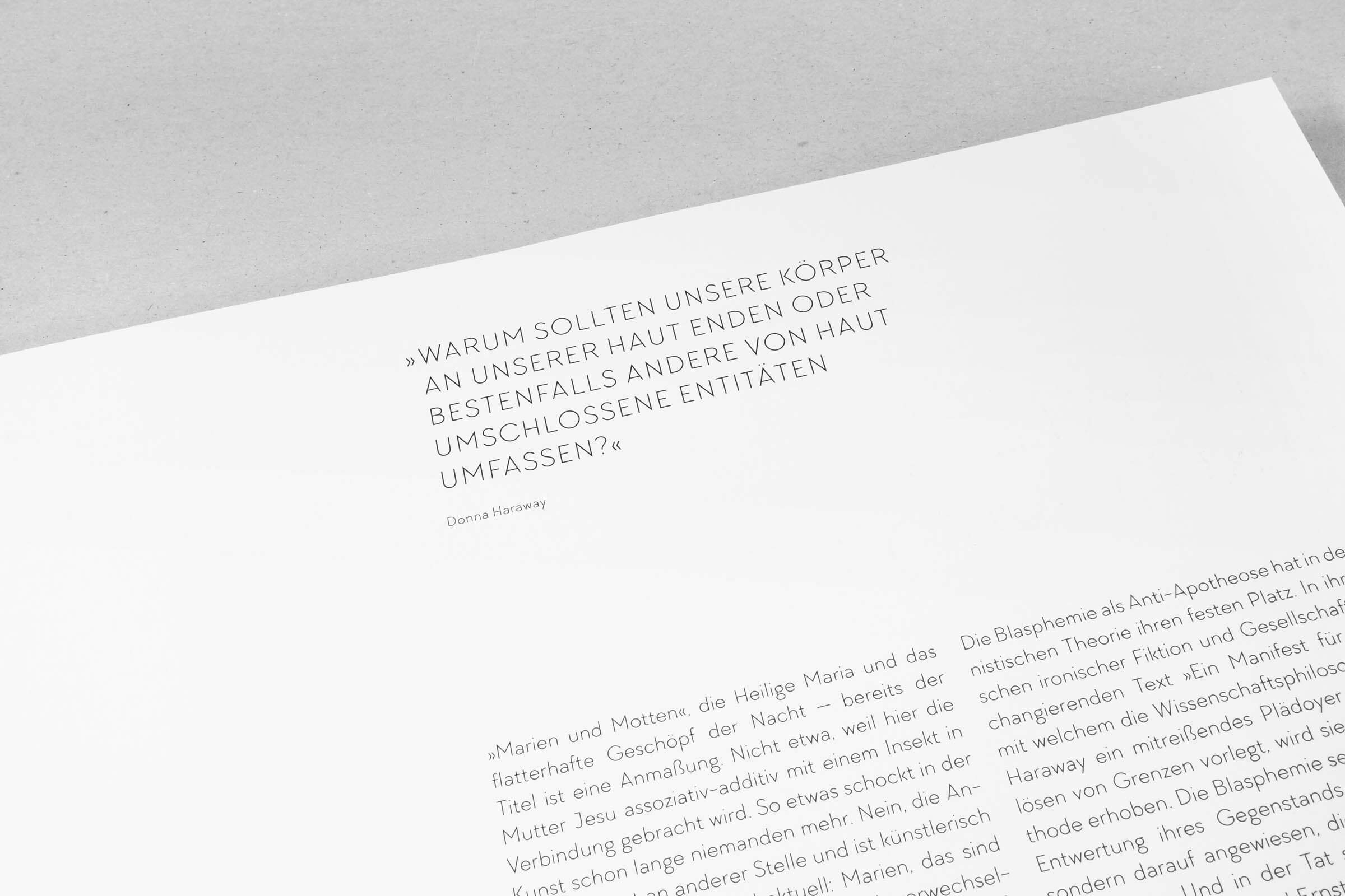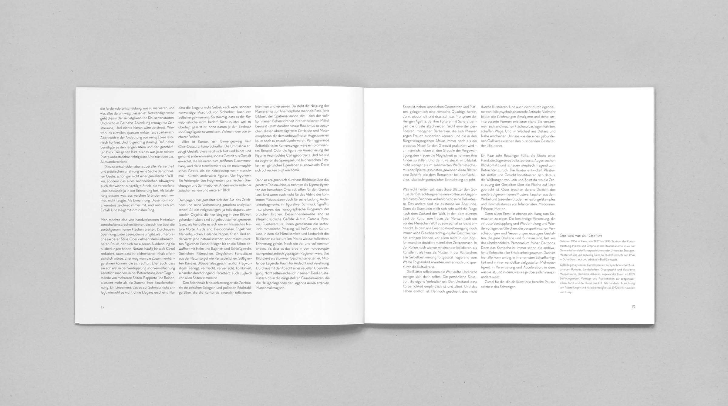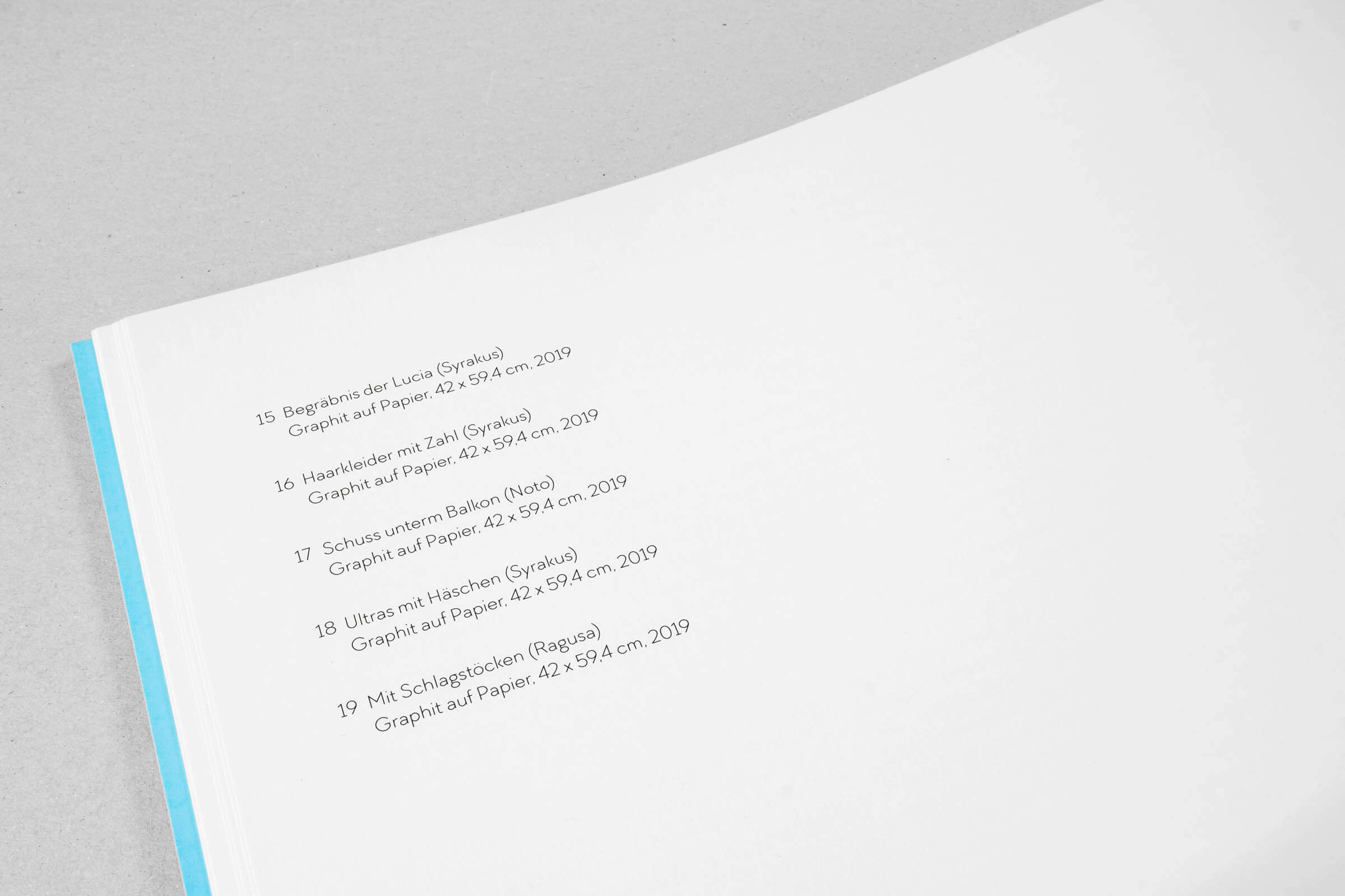 Bei diesem Buchprojekt stand die Materialität im Mittelpunkt: Der rote Buchrücken, die raue, graue Buchbinderpappe und das blaue Vor- und Nachsatzpapier setzen einen starken Rahmen. Im Inneren warten die Zeichnungen von Bettina van Haaren darauf, entdeckt zu werden. Die Texte verbinden sich mit viel Freiraum mit den Abbildungen. Beim Durchblättern erfreut man sich am selbstbestimmten Auftauchen des hellblauen Vor- und Nachsatzpapiers, das wie eine Klammer das Buch zusammenhält.