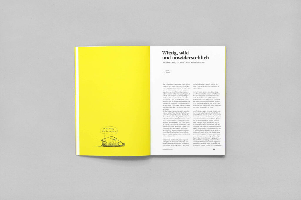 In der Illustrationsszene ist die Laborgemeinschaft aus Frankfurt äußerst bekannt, vielfach gefeiert und mit zahlreichen Auszeichnungen bedacht. Anlässlich ihres 20-jährigen Bestehens wurde unter anderem im Troisdorfer Bilderbuchmuseum eine Ausstellung veranstaltet. Begleitet wurde diese Ausstellung von einem Katalog, der zeigt, wie unterschiedlich und doch verbindend die einzelnen Labormitglieder arbeiten. Er präsentiert Projekte, die sie entweder gemeinsam oder in kleinen Gruppen umgesetzt haben. Durch das Labor sind bereits viele herausragende Werke in die Welt gekommen! Weiter so!