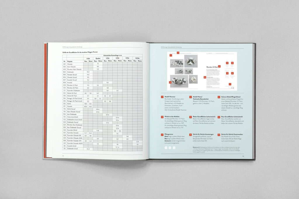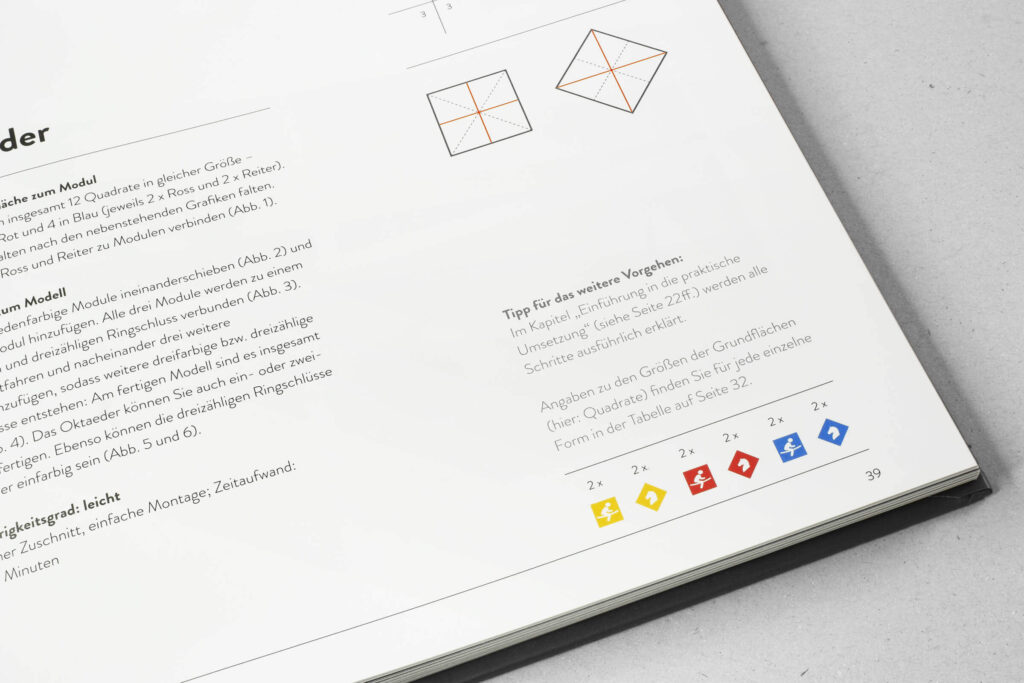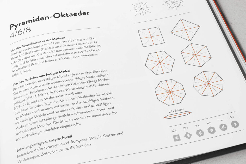 Fernöstliche und westliche Faltkunst – neu interpretiert und weitergedacht. Wie können komplexe Papiermodelle verstanden und nachgebaut werden? Ein Blick in das Buch zeigt, dass ein klares Gestaltungsraster die verschiedenen Informationsebenen gut strukturiert und somit einen einfachen Einstieg ermöglicht. Auf der linken Seite werden durch Fotos deutlich, wie die Modelle real aussehen und wie sie zusammengebaut werden. Auf der rechten Seite befindet sich eine Anleitung mit erläuternden Grafiken. So wird der Beginn eines neuen Hobbys leicht gemacht: Los geht’s!