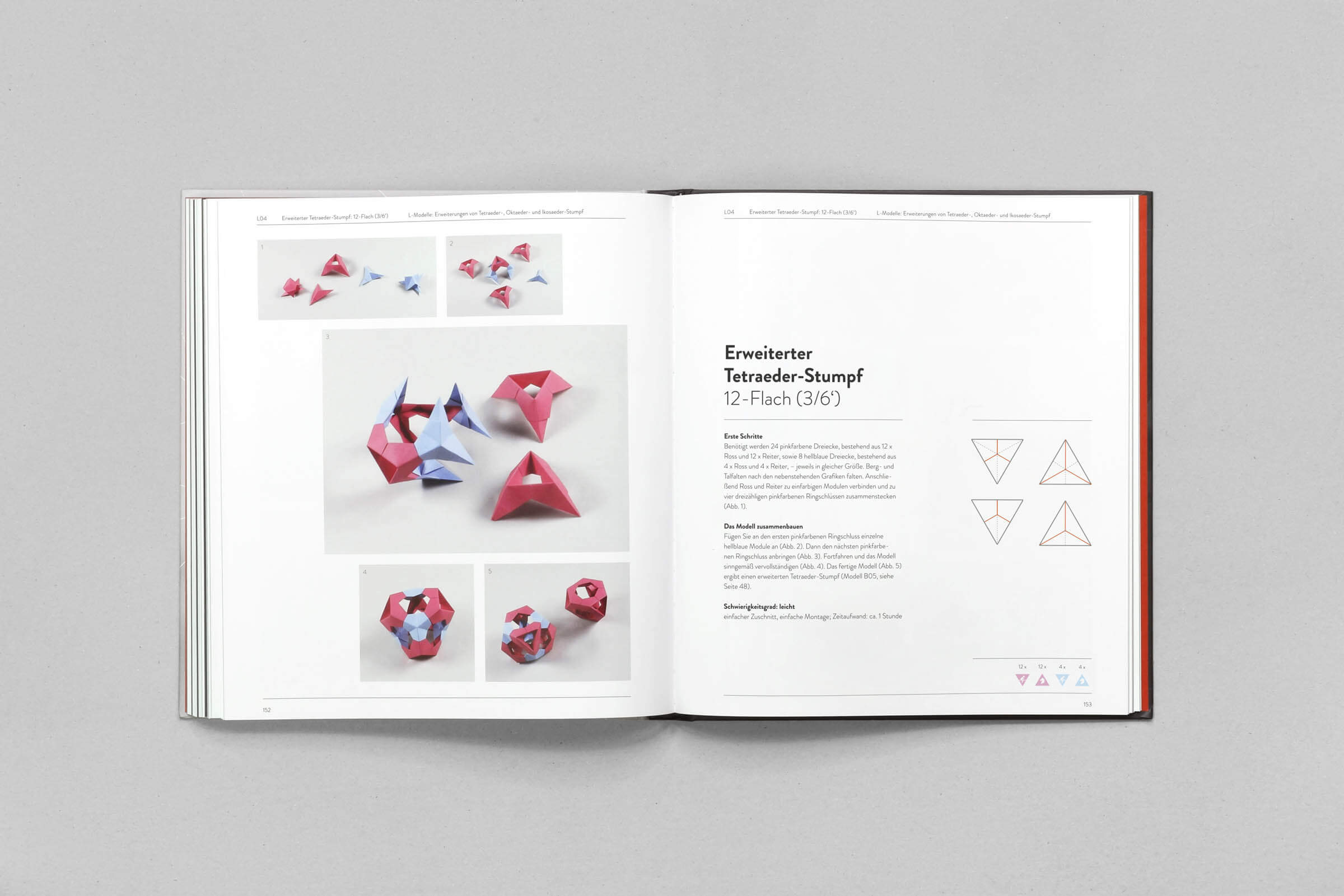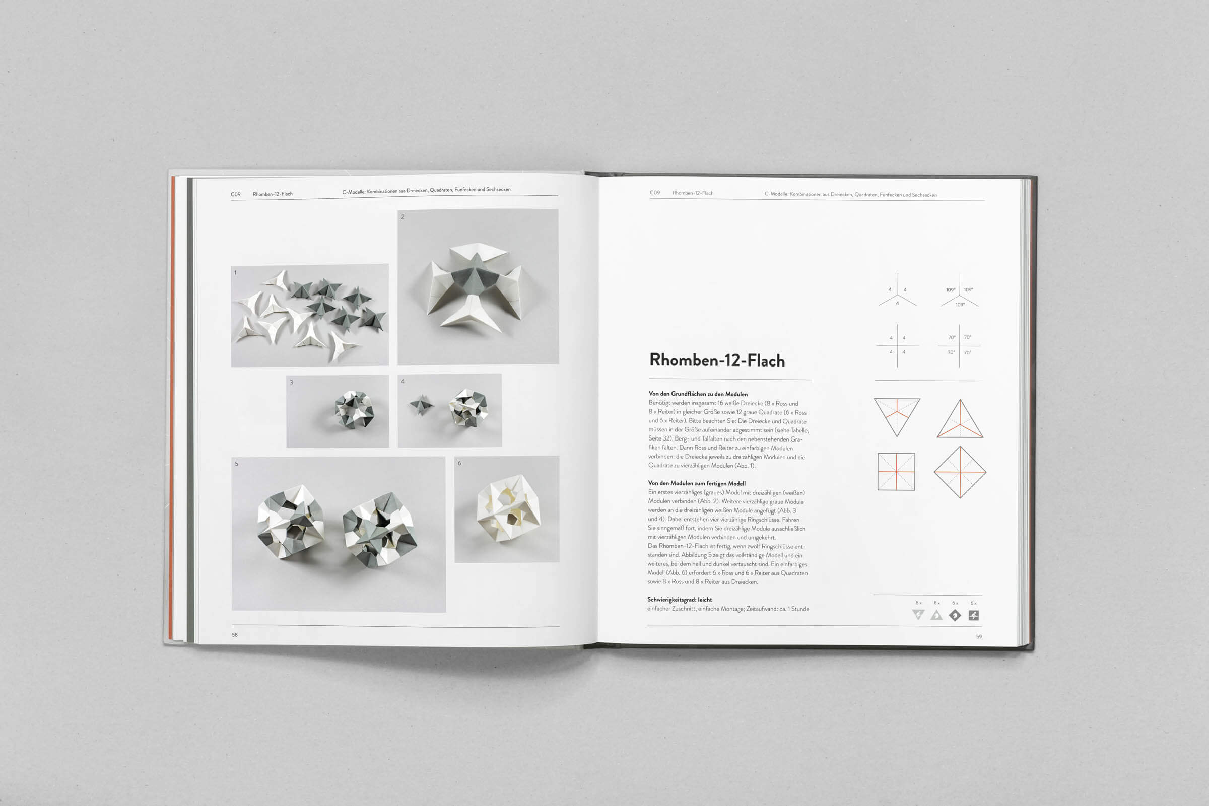 Fernöstliche und westliche Faltkunst – neu interpretiert und weitergedacht. Wie können komplexe Papiermodelle verstanden und nachgebaut werden? Ein Blick in das Buch zeigt, dass ein klares Gestaltungsraster die verschiedenen Informationsebenen gut strukturiert und somit einen einfachen Einstieg ermöglicht. Auf der linken Seite werden durch Fotos deutlich, wie die Modelle real aussehen und wie sie zusammengebaut werden. Auf der rechten Seite befindet sich eine Anleitung mit erläuternden Grafiken. So wird der Beginn eines neuen Hobbys leicht gemacht: Los geht’s!