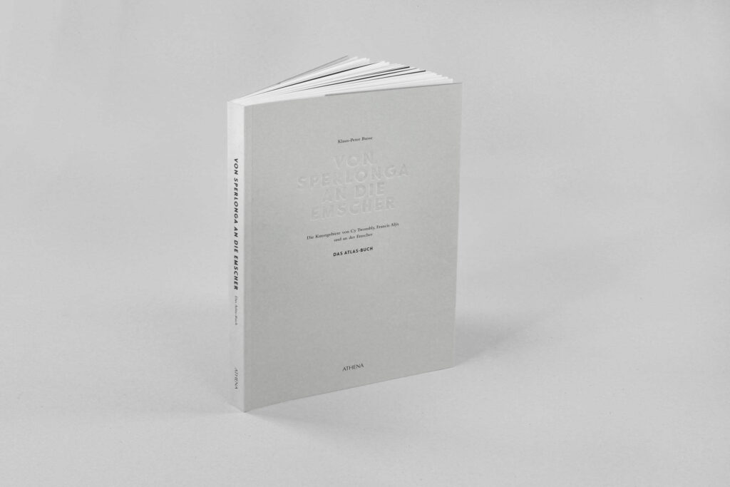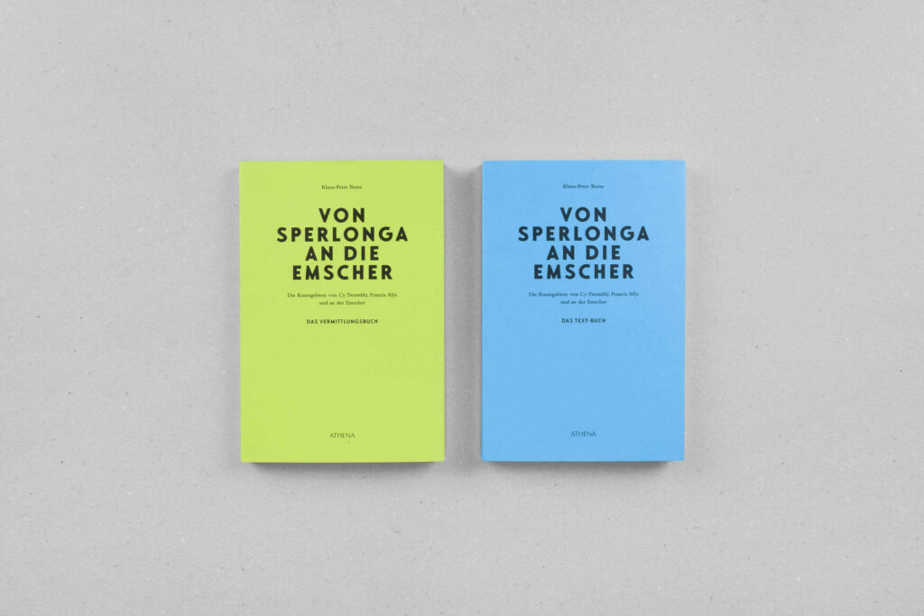 In seinen drei Büchern untersucht Klaus-Peter Busse die Kunstgebiete von Cy Twombly und Francis Alÿs und setzt sie in Bezug zum ehemaligen Abwasserfluss Emscher. Ein Gestaltungskonzept mit weißen und schwarzen Textseiten, einem großzügigen Satzspiegel und auffälligen Bildseiten verleiht den Büchern eine prägende Rhythmik mit Sogwirkung. Je nach Informationsgrad wechselt die Schriftart – wichtige Informationen sind auffällig in Versalien gesetzt. Es kommt gleichermaßen auf das Detail als auch auf das große Ganze an.