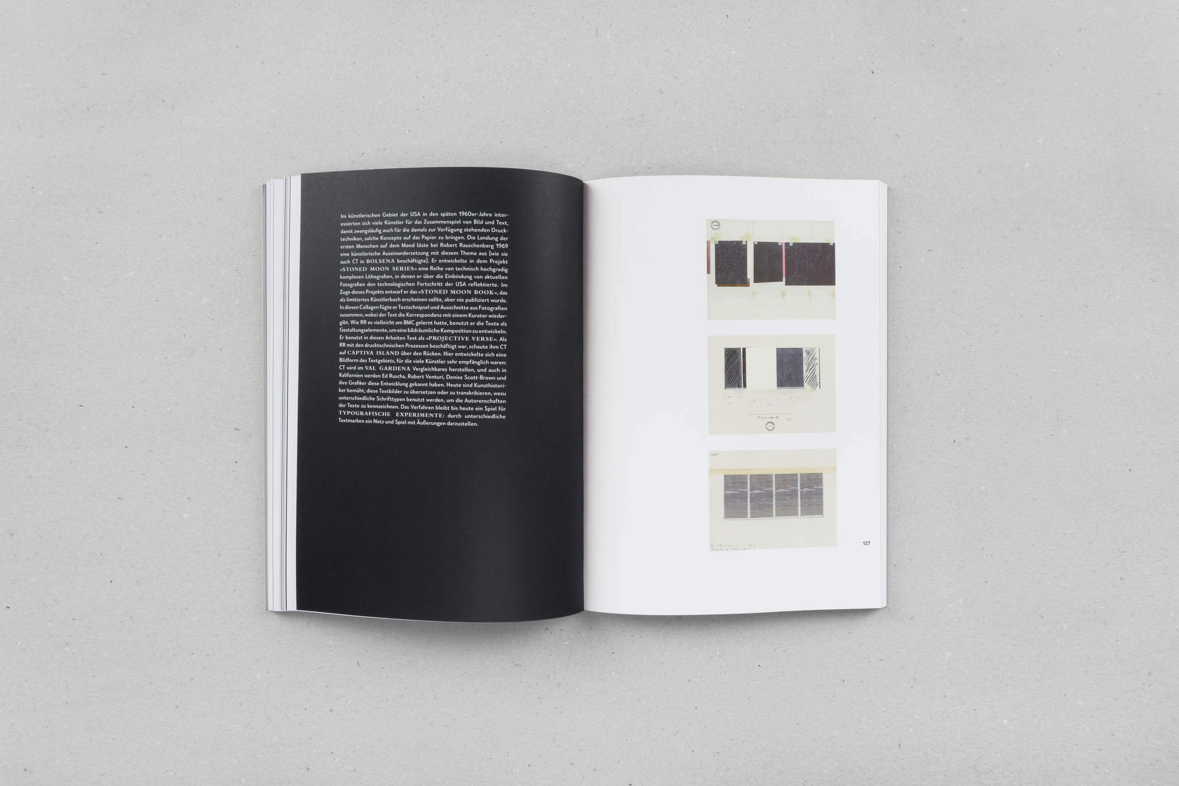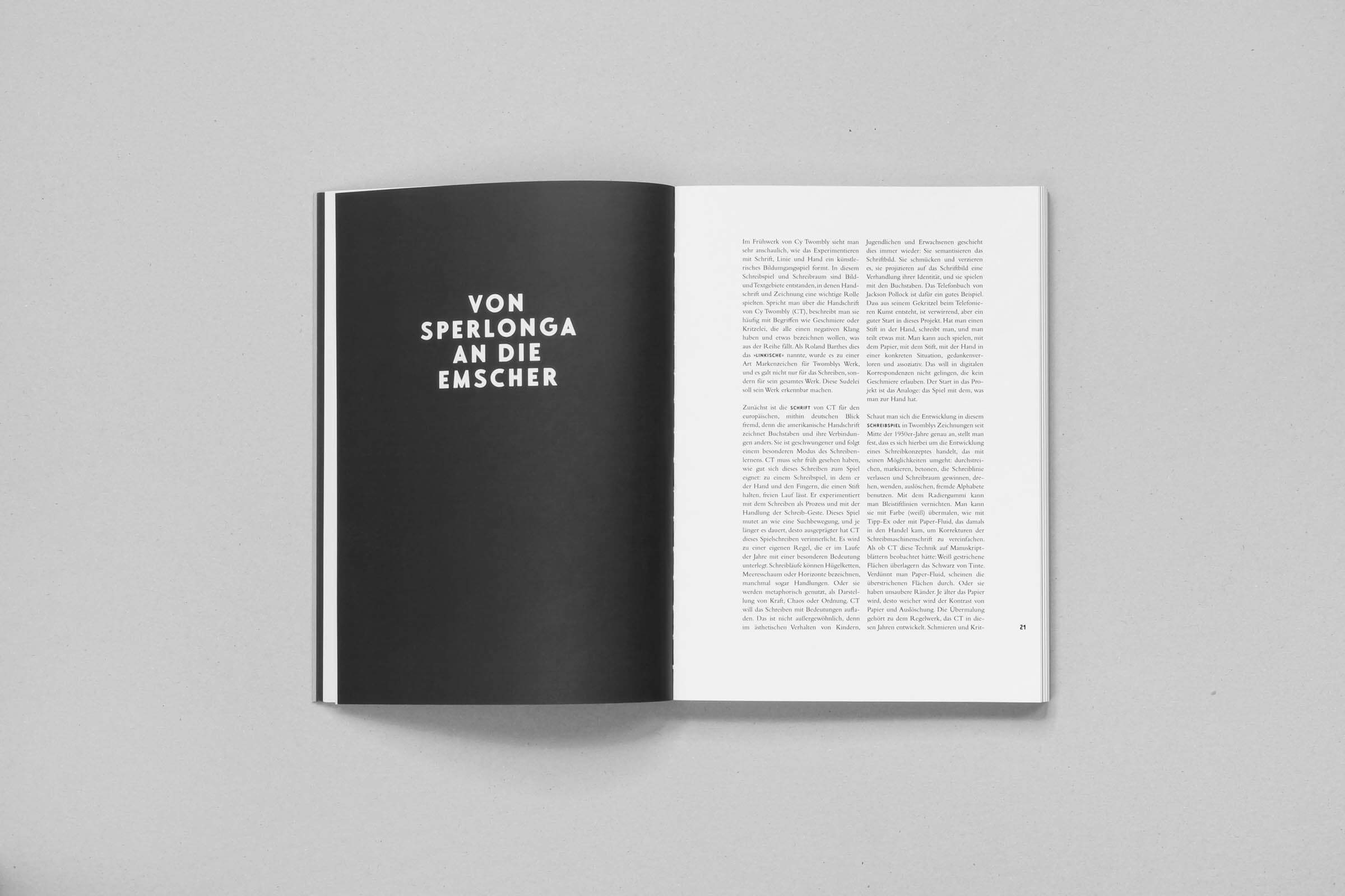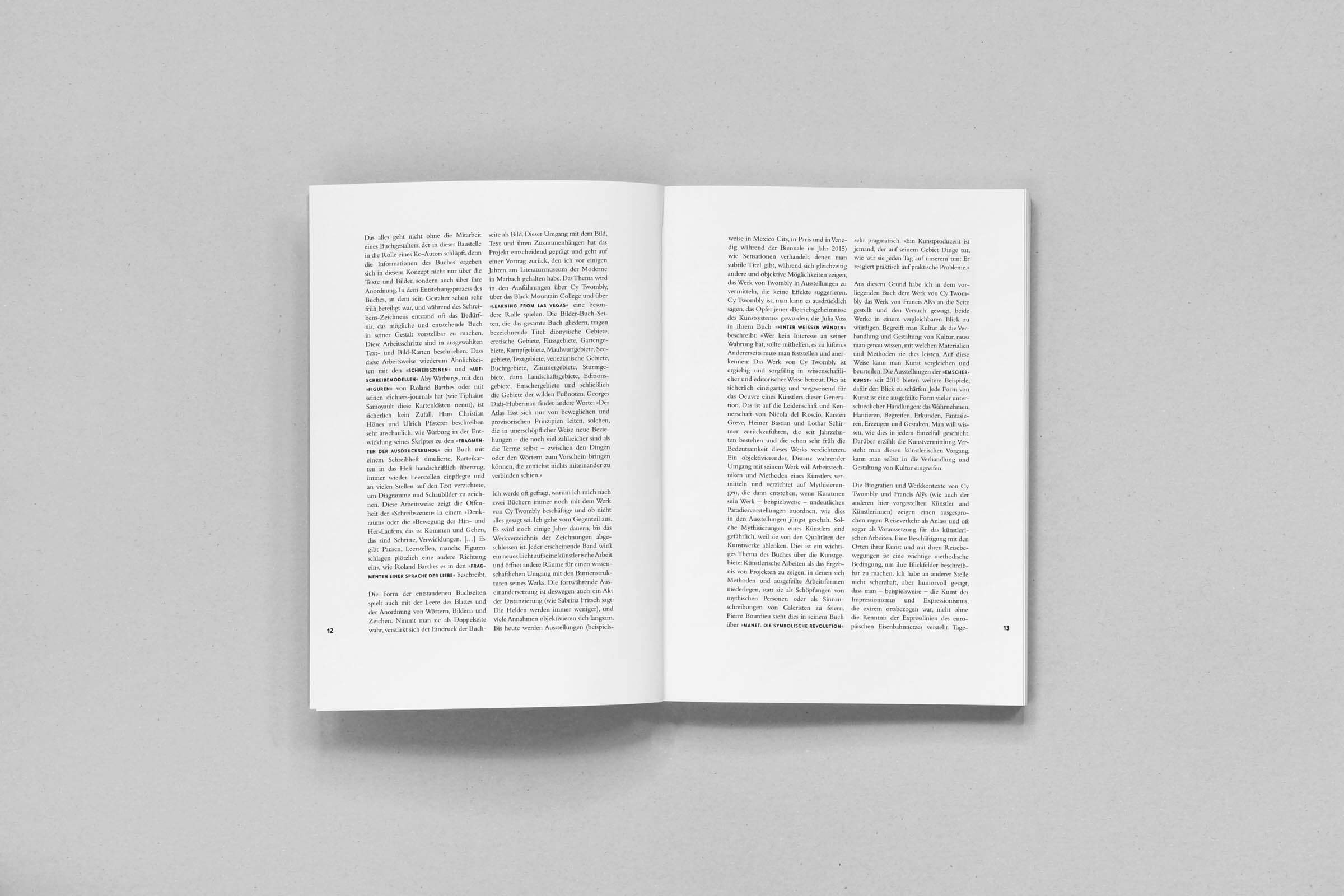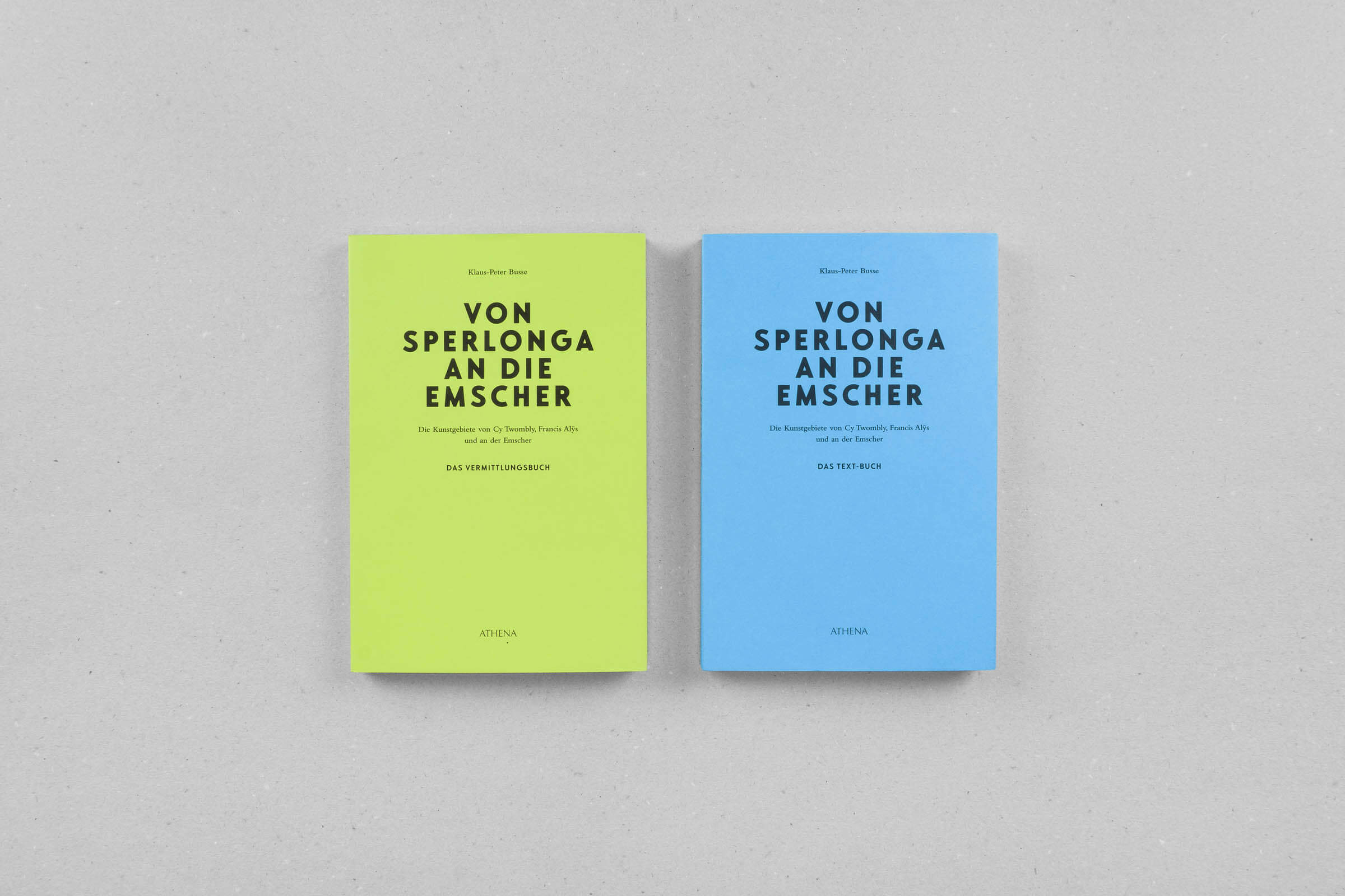 In seinen drei Büchern untersucht Klaus-Peter Busse die Kunstgebiete von Cy Twombly und Francis Alÿs und setzt sie in Bezug zum ehemaligen Abwasserfluss Emscher. Ein Gestaltungskonzept mit weißen und schwarzen Textseiten, einem großzügigen Satzspiegel und auffälligen Bildseiten verleiht den Büchern eine prägende Rhythmik mit Sogwirkung. Je nach Informationsgrad wechselt die Schriftart – wichtige Informationen sind auffällig in Versalien gesetzt. Es kommt gleichermaßen auf das Detail als auch auf das große Ganze an.