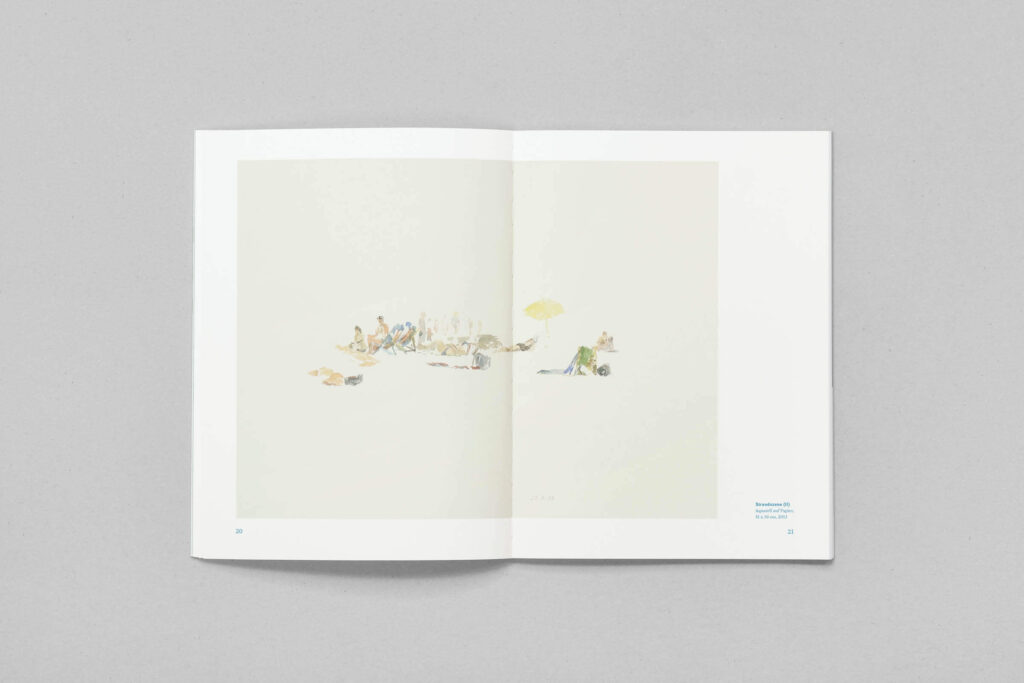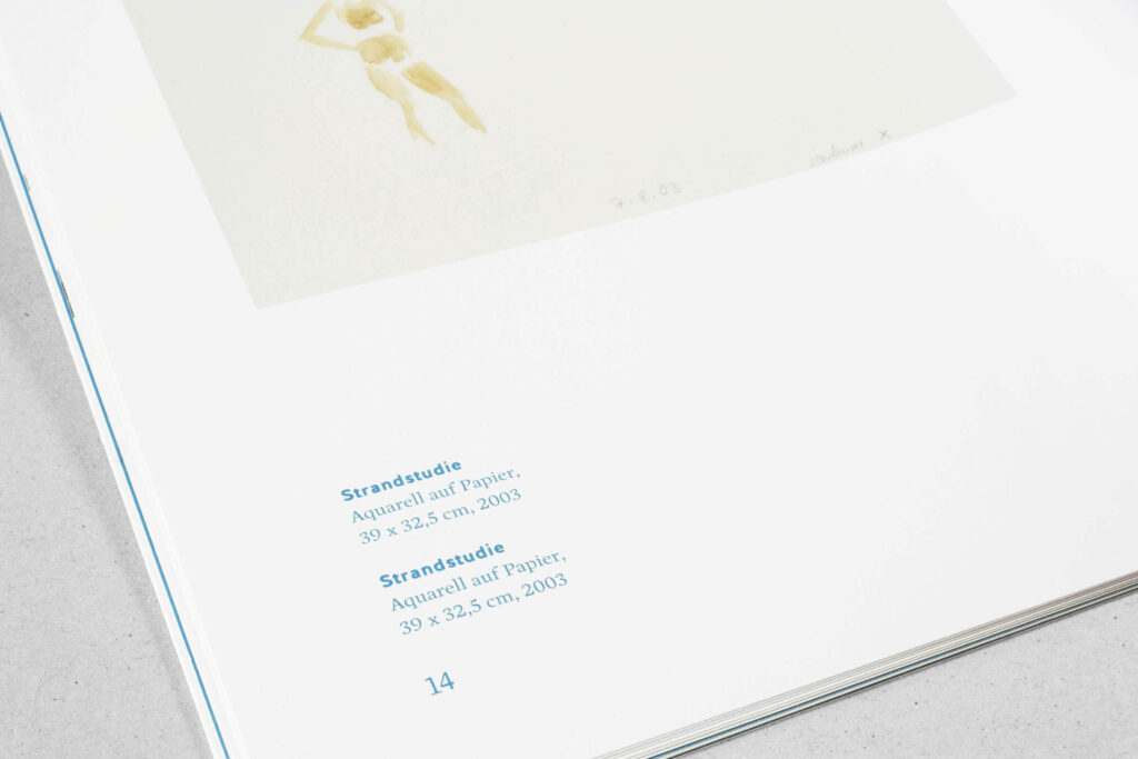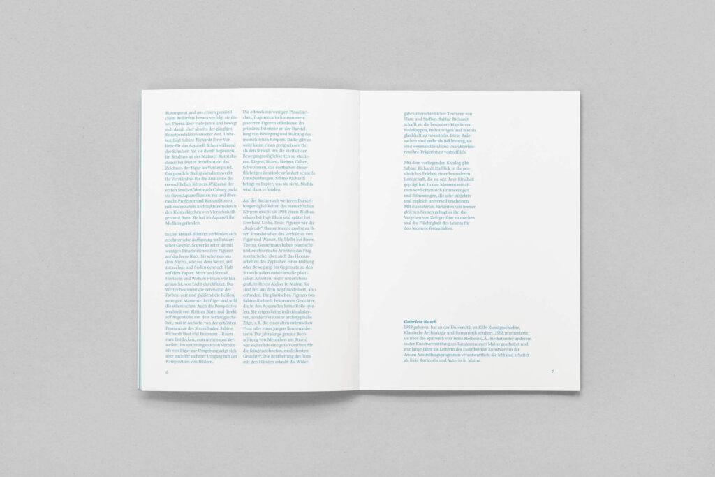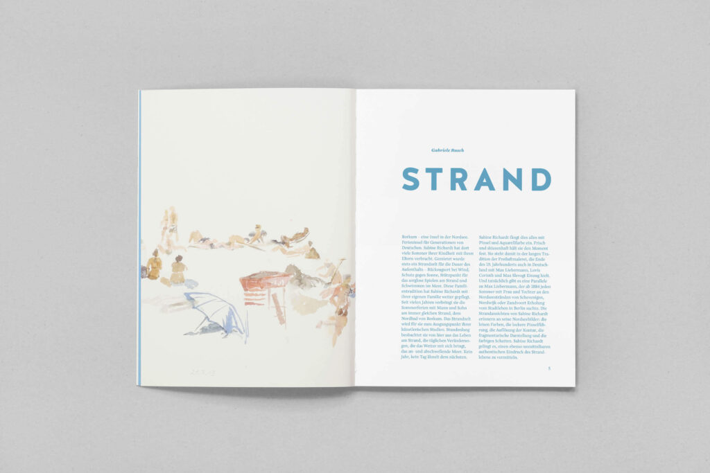 Sabine Richardt arbeitet sowohl auf Papier als auch dreidimensional mit Ton. Mit herausragendem Können fängt sie Strandszenen mit Aquarellfarben auf Papier ein, wobei präzise Pinselstriche badende oder sich sonnende Menschen lebendig werden lassen. Auch in ihren Tonplastiken bleibt sie dem Strandthema treu, indem sie Figuren erschafft, die am Strand baden, liegen, stehen oder schwimmen. Der vorliegende Ausstellungskatalog entführt den Leser auf eine kleine Urlaubsreise, eine willkommene Auszeit vom Alltag.
