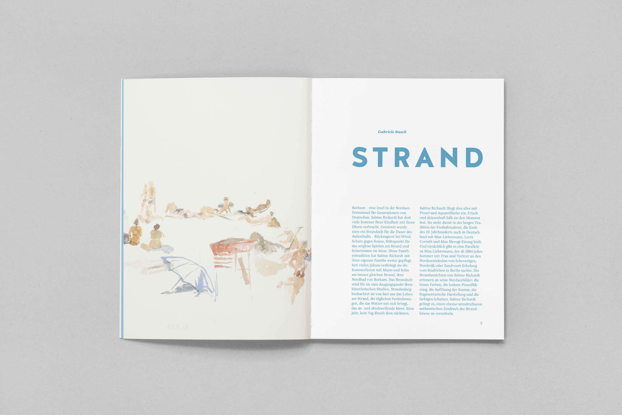 Sabine Richardt arbeitet sowohl auf Papier als auch dreidimensional mit Ton. Mit herausragendem Können fängt sie Strandszenen mit Aquarellfarben auf Papier ein, wobei präzise Pinselstriche badende oder sich sonnende Menschen lebendig werden lassen. Auch in ihren Tonplastiken bleibt sie dem Strandthema treu, indem sie Figuren erschafft, die am Strand baden, liegen, stehen oder schwimmen. Der vorliegende Ausstellungskatalog entführt den Leser auf eine kleine Urlaubsreise, eine willkommene Auszeit vom Alltag.