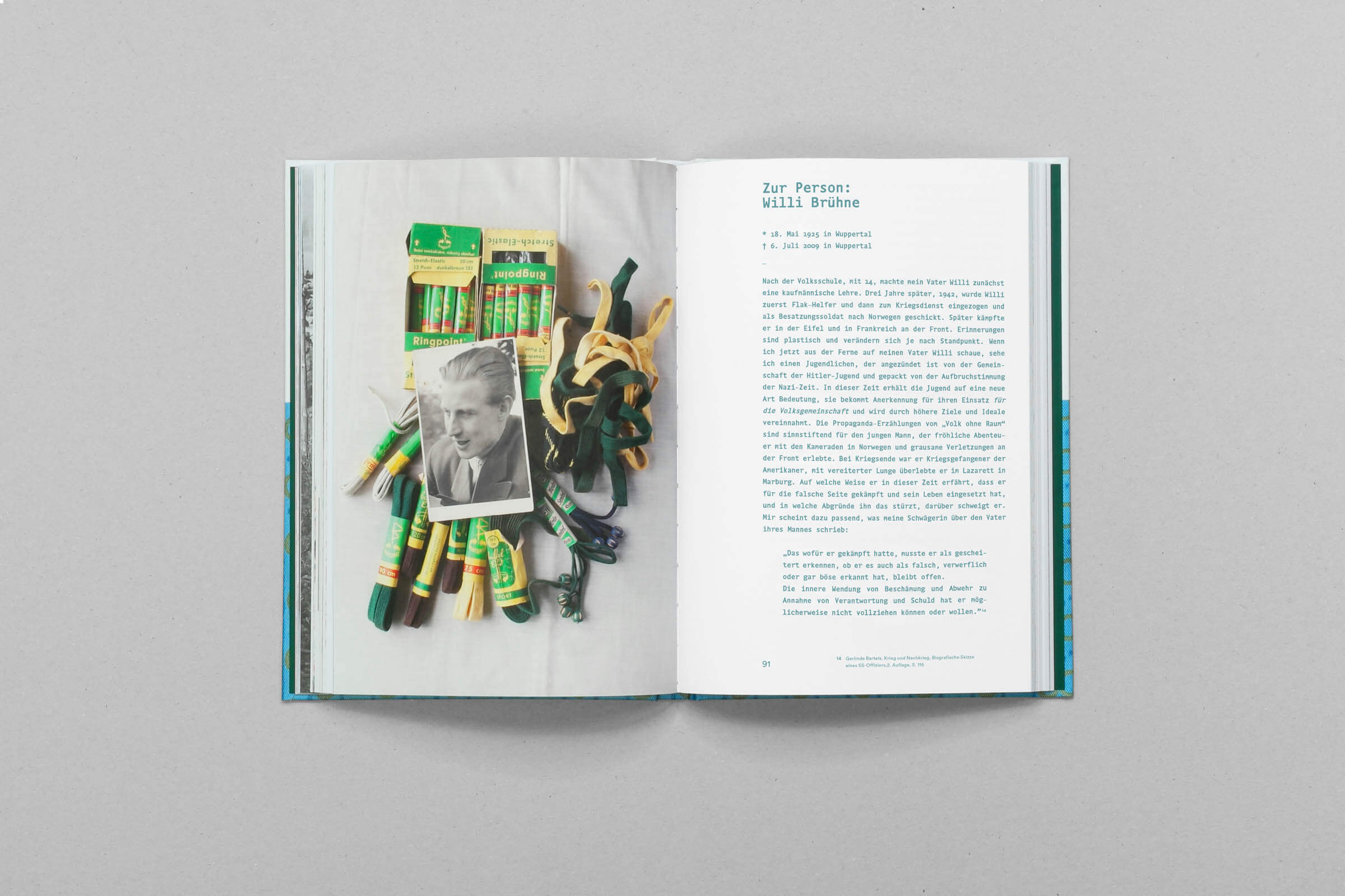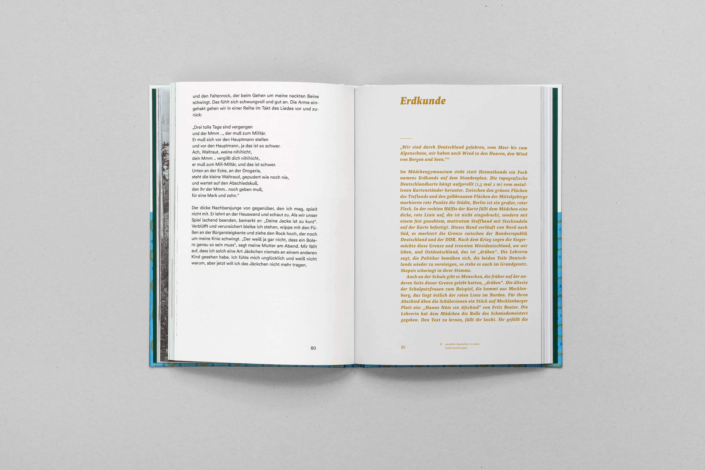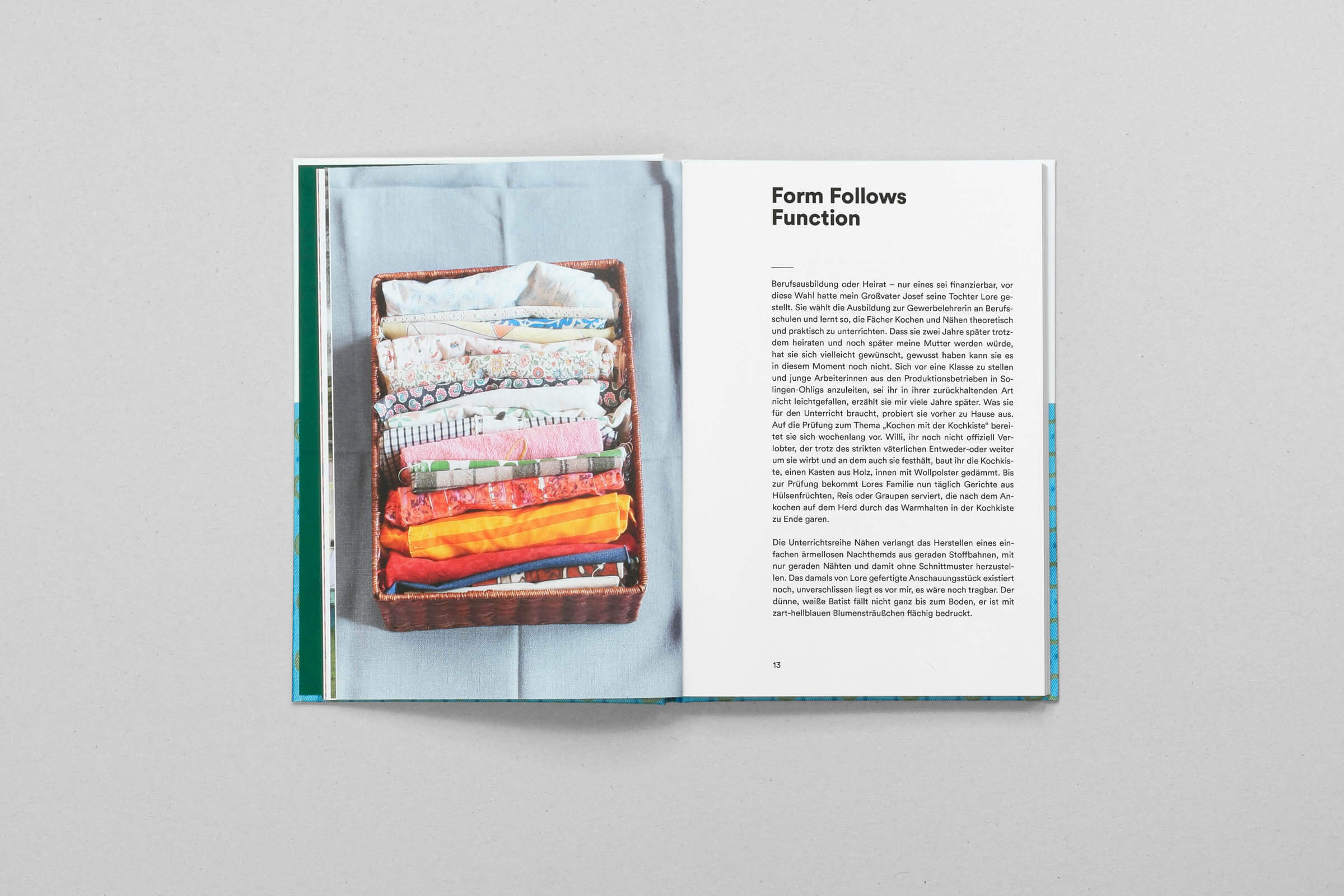 Christine Schubarth erzählt in diesem Buch Familiengeschichten, während der Leser gleichzeitig viel über Stoffe und das Nähen erfährt. Die Typografie ist differenziert: Jede Textart ist mit einer anderen Schrift oder einem anderen Schriftschnitt gesetzt, Biografien beispielsweise in einer sachlich wirkenden Monotype-Schrift. Die Geschichten hingegen strahlen durch die Verwendung einer warmen, dunkelorangefarbenen Serifenschrift Wärme aus. Die von der Autorin komponierten Fotos strukturieren den Inhalt und lassen alle Bereiche passend zusammenfinden.